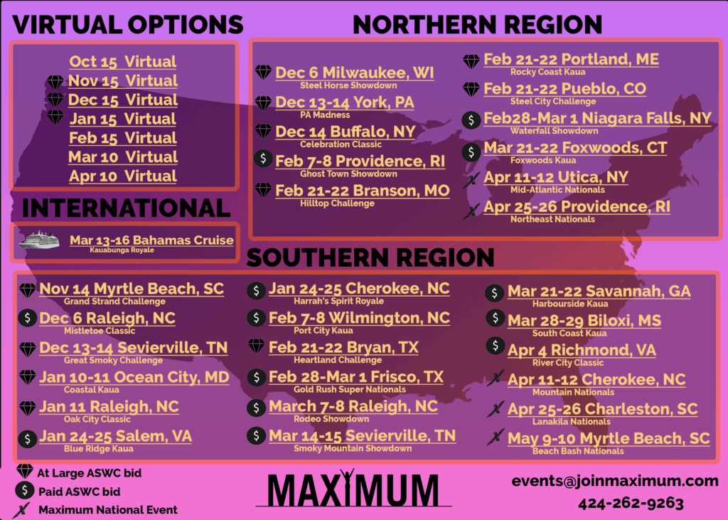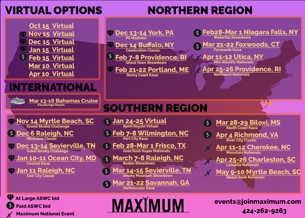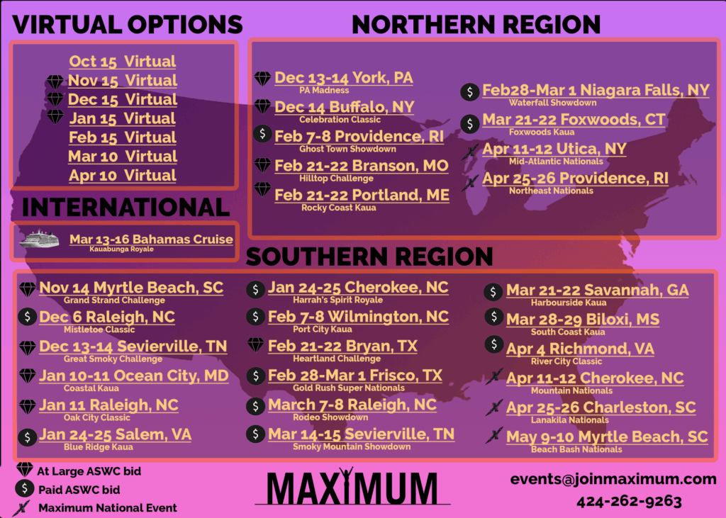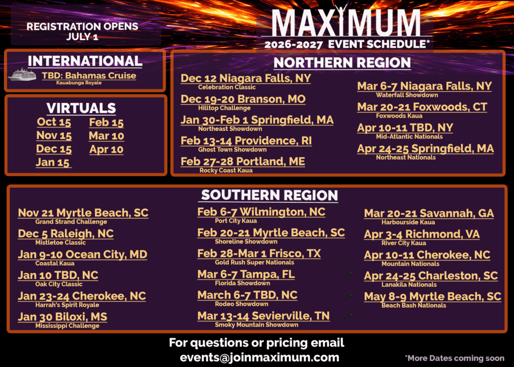 Join Maximum this season with camp, one-day events, two-day events, and a one of a kind Cruise Competition, Registration is Open!